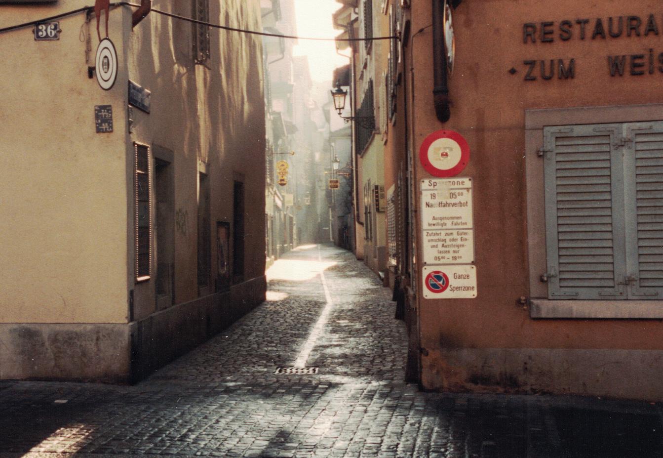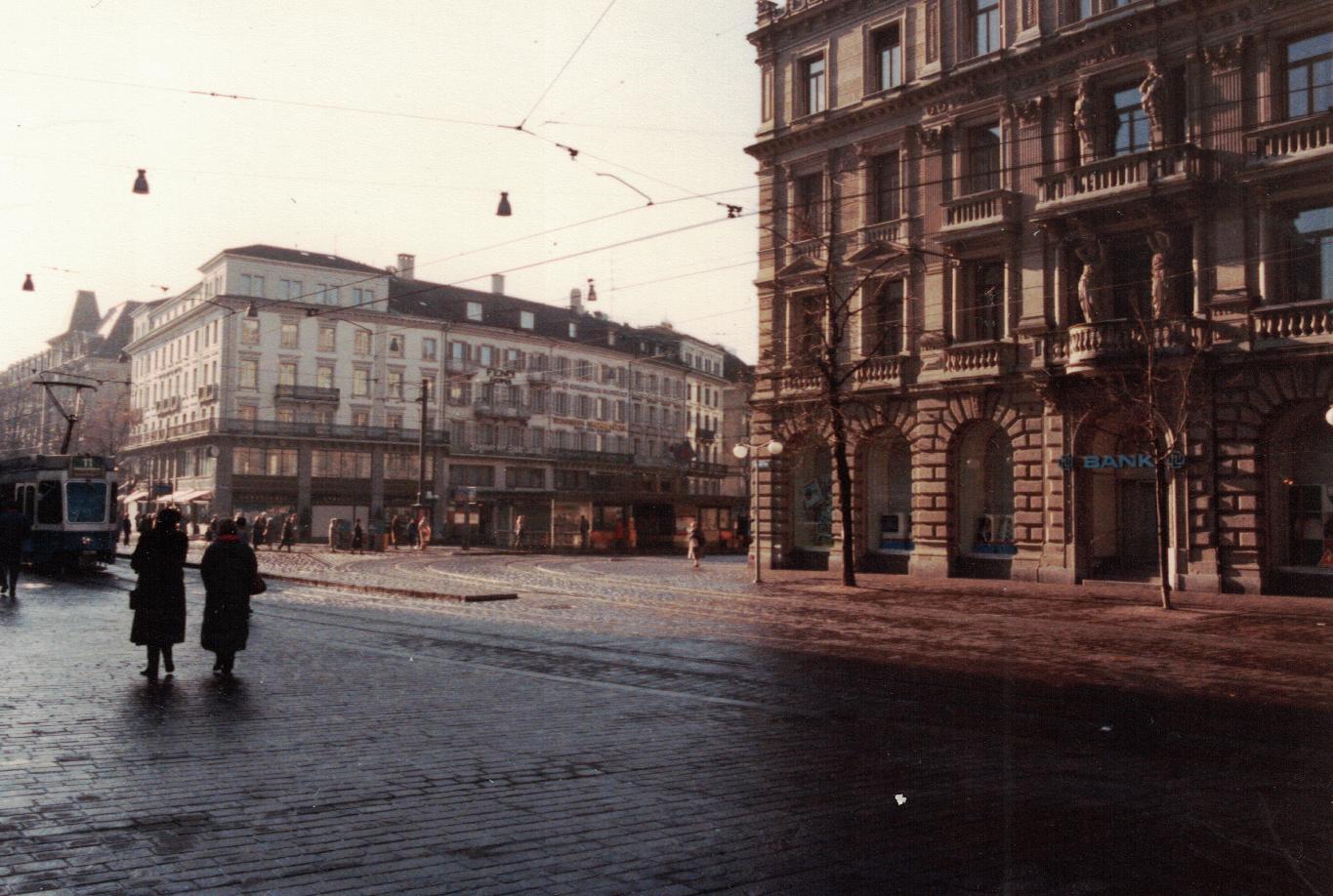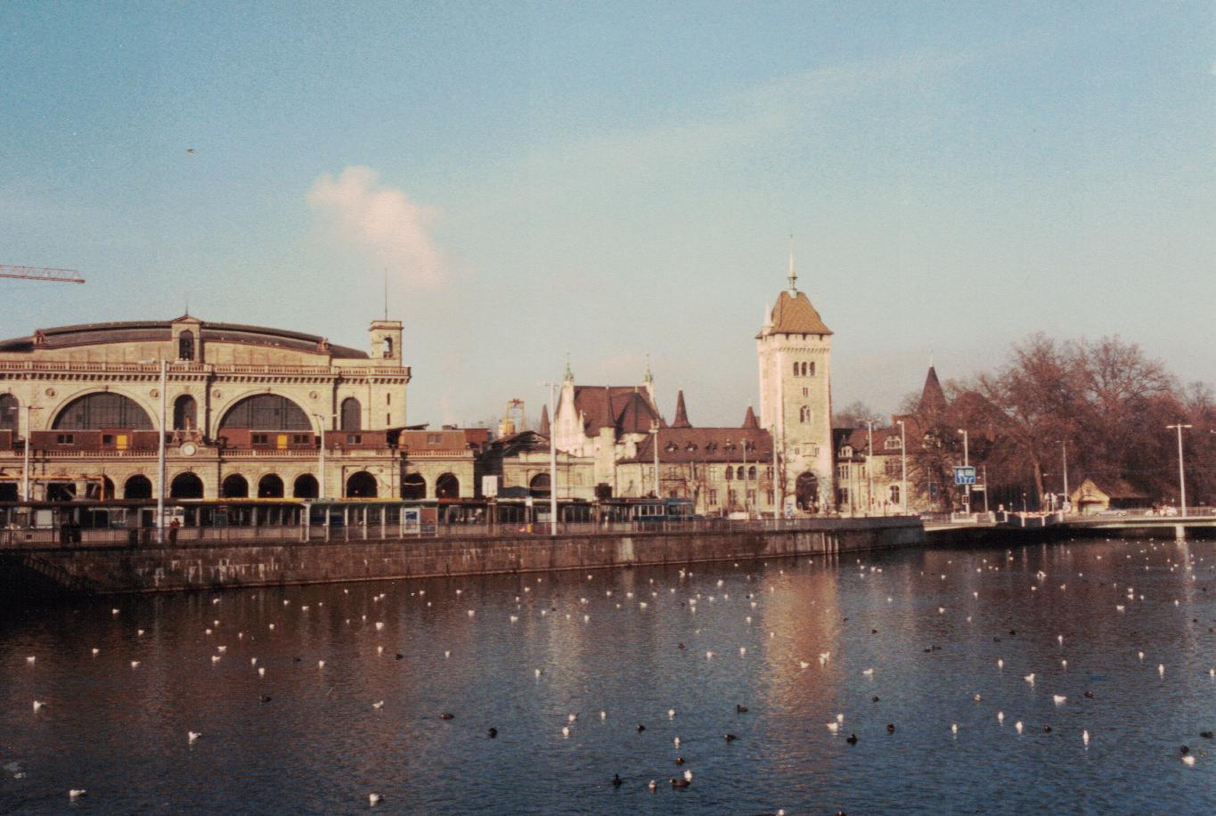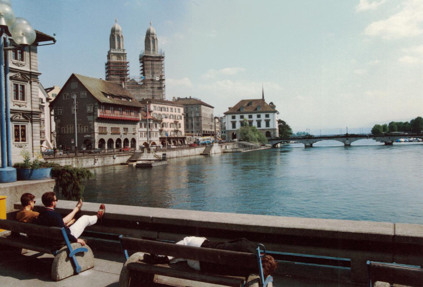 Pretty boring. I ask the conductor a question. He doesn't speak English and looks like he hates my existence. I get on the train not knowing whether I'm in the peasant class section I paid for or not. On the way to Zürich he stamps my ticket. Thanks to English speaking people there I get off at the right place. There's lots of trains there. I guess thats why they call it a train station. I wander about and finally go outside and grab one of the taxis waiting there. He doesn't speak English. No problem. I came prepared with the address of the hotel written down. I give him 10 Swiss-francs and he's happy.
