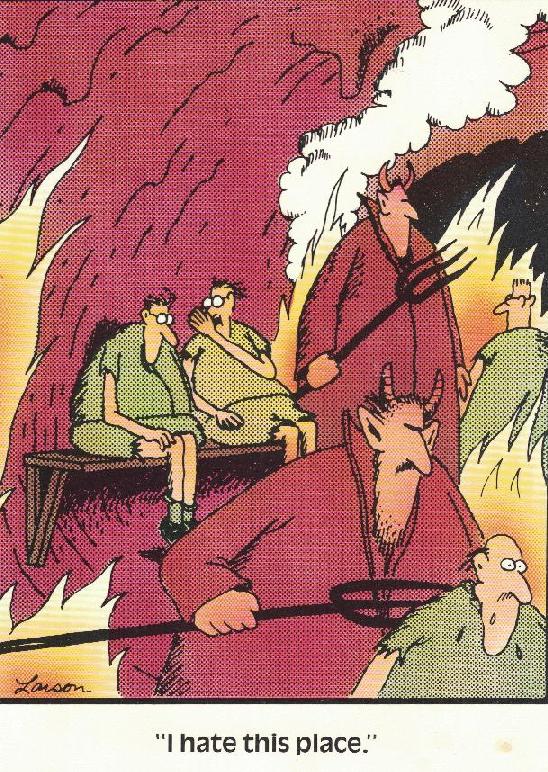 Some guy named George dies. He goes to the waiting station and Saint Peter says, 'Well, George, you've been a real good guy so you have your choice of either going to Heaven or Hell. George is a little smarter than the average guy, so he asks if he can see what each is like first before making a decision. Sure. So he checks out Heaven and sees these guys sitting around on clouds playing harps with idiot smiles on their faces. He goes to Hell and sees nightclubs and parties and fabulous babes and stuff. He goes back and says 'I wanna goto Hell'. St. Peter says, ' Are you sure? This is for eternity you know'. 'Yeh, I'm sure'. So he goes to Hell and they give him a pitch-fork and stick him in a coal mine. 'So what about the parties and nightclubs and fabulous babes?' asks George. 'Well, before, you were a tourist. Now you're an immigrant'.